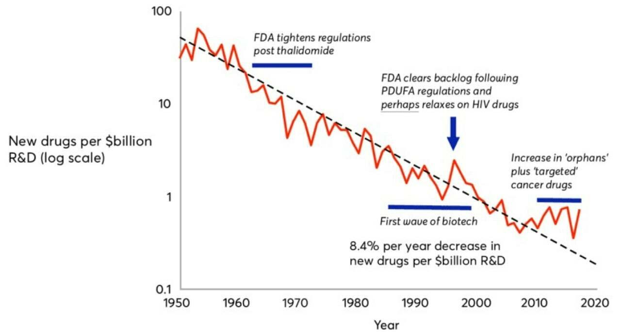 Drug discovery has been witnessing an inverse of Moore's law -- pharma companies are spending increasingly more $ on fewer drugs (drugs brought to market per billion$ of R&D).