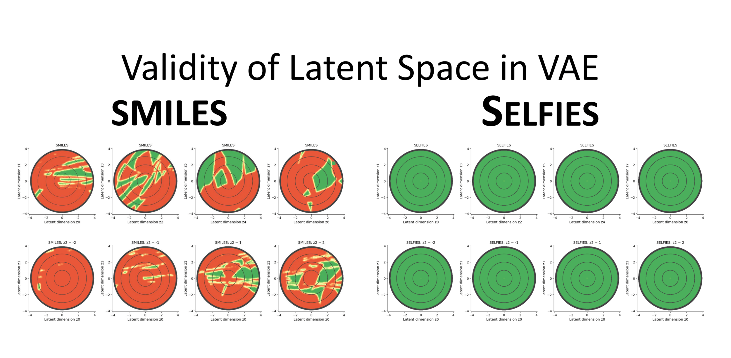 Red denotes dead regions in the latent space which decode to invalid strings.