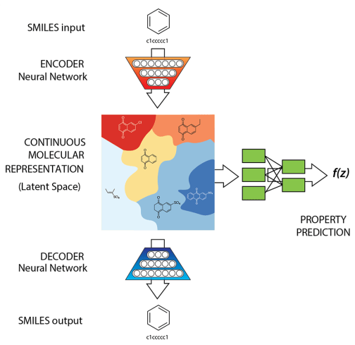 Gómez-Bombarelli R, et al. Automatic chemical design using a data-driven continuous representation of molecules. ACS central science. 2018. (ChemicalVAE)