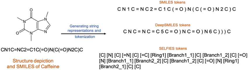 Krenn M, Häse F, Nigam A, Friederich P, Aspuru-Guzik A. Self-referencing embedded strings (SELFIES): A 100% robust molecular string representation. Machine Learning: Science and Technology. 2020 Oct 28;1(4):045024.