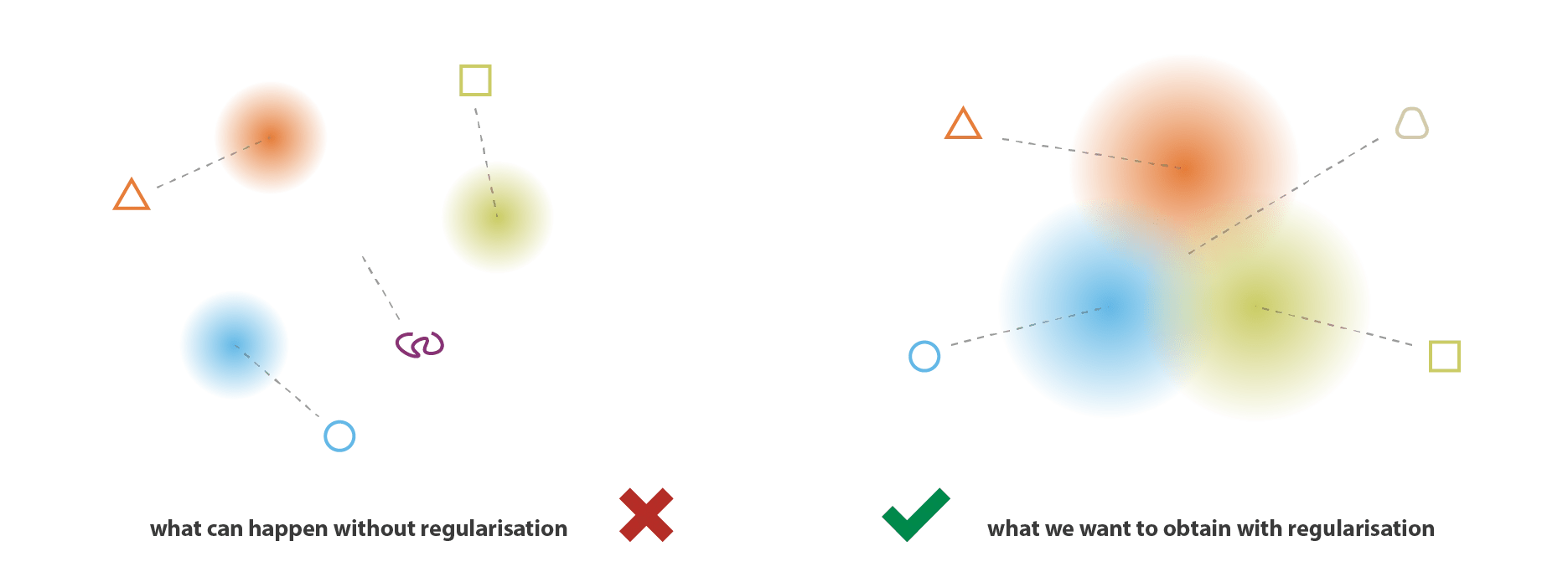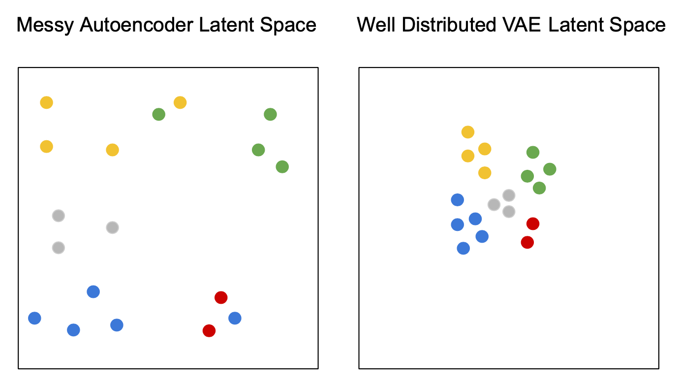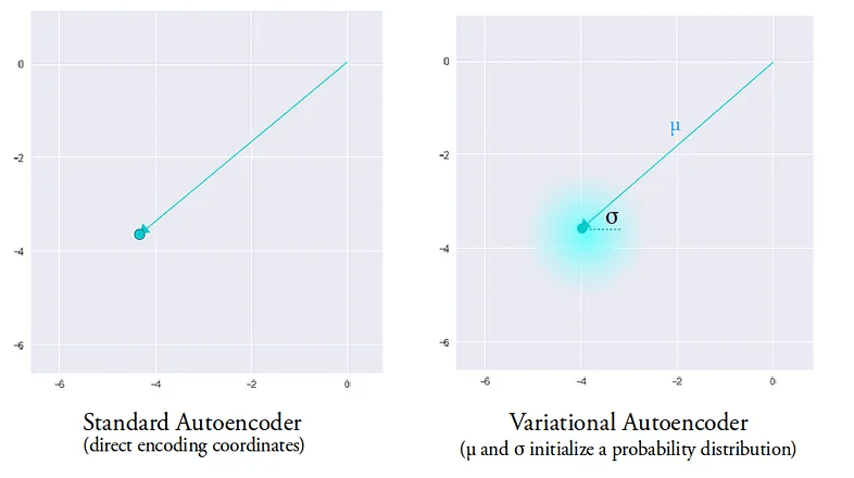 A single encoding of an autoencoder vs. a variational autoencoder in a 2d latent space.