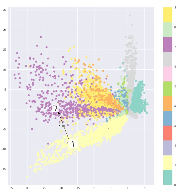The latent space shows the cluster-forming nature of the encodings encouraged by the reconstruction loss objective. Distinct encodings for each image type makes it easier for the decoder to decode them, but the space is non-contiguous.