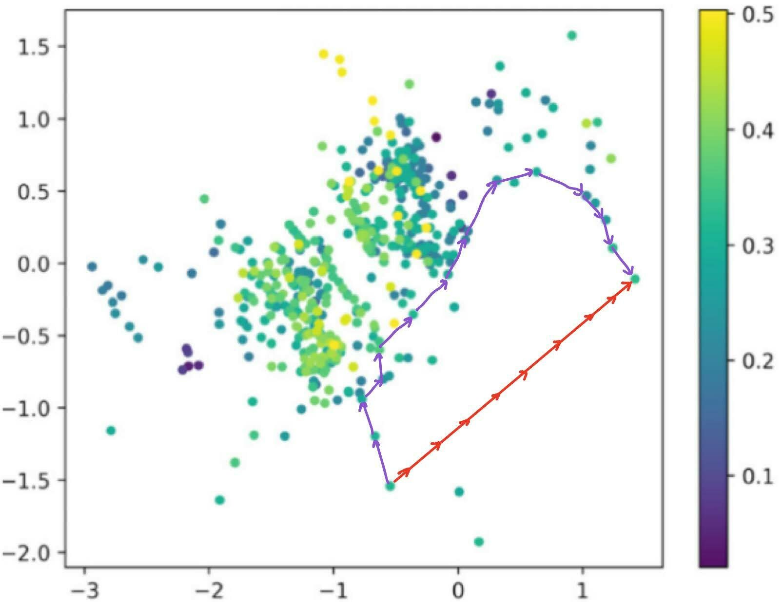 Dead zones in (a subspace of) the latent space. The Euclidean interpolation (red) visits degenerate latent embeddings, while slerp traces a path through the regions where there is valid data.