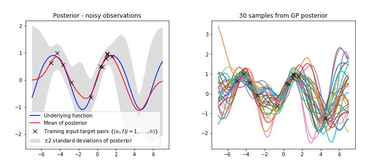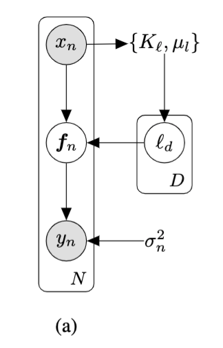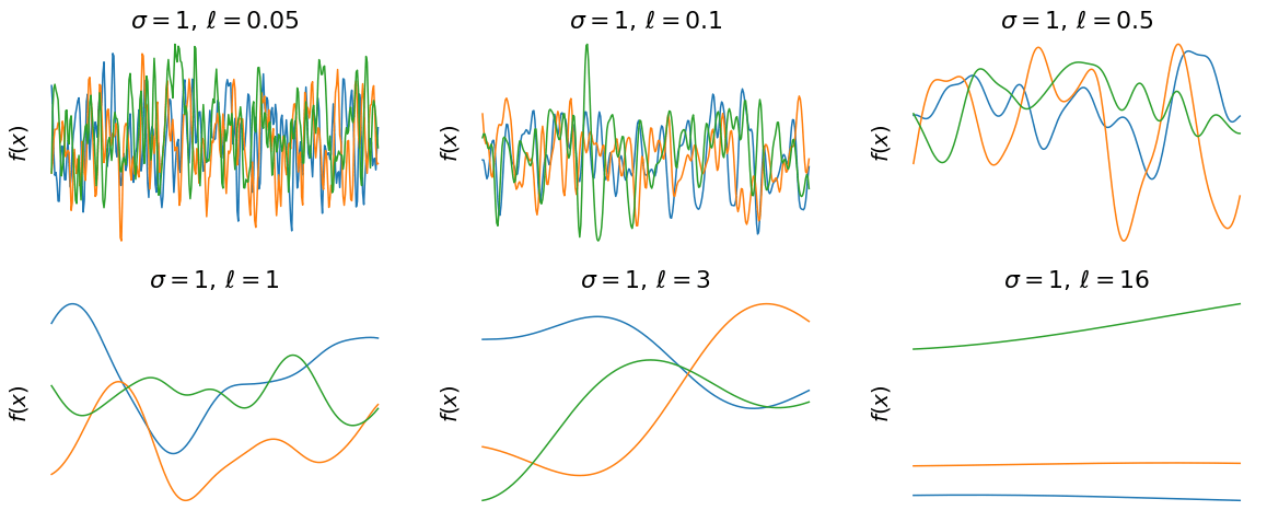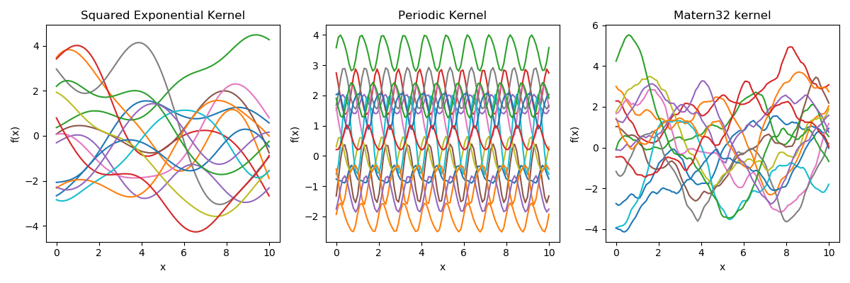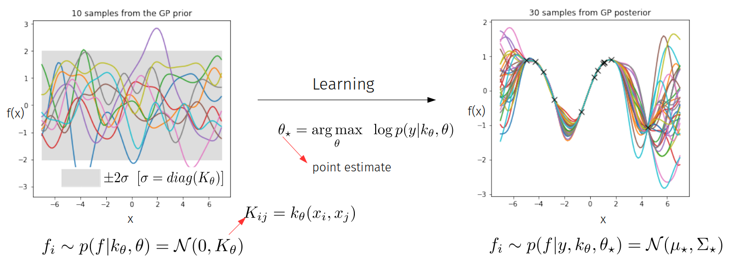 The mathematical crux of a GP is that \( \textbf{f} \equiv [f(x_{1}), f(x_{2}), f(x_{3}),....., f(x_{N})]\) is just a draw from a N-dimensional multivariate Gaussian.
