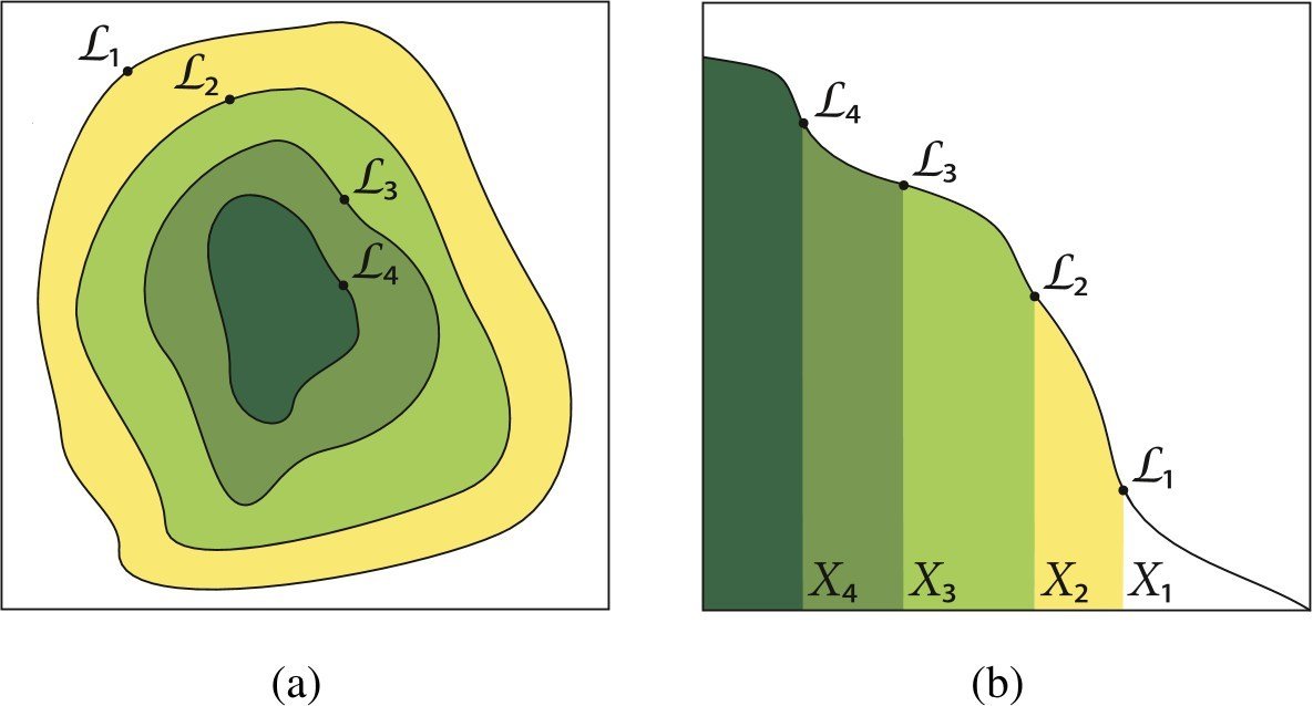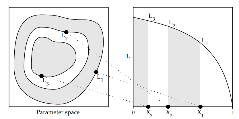 One can re-cast the multi-dimensional evidence integral as a 1d function of prior volume \( X\).