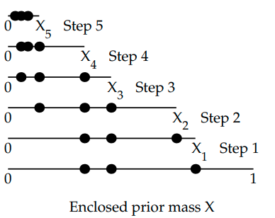 $$ \mathcal{Z} = \int \mathcal{L}(\theta)\pi(\theta)d\theta = \int_{0}^{1} \mathcal{L}(X)dX$$