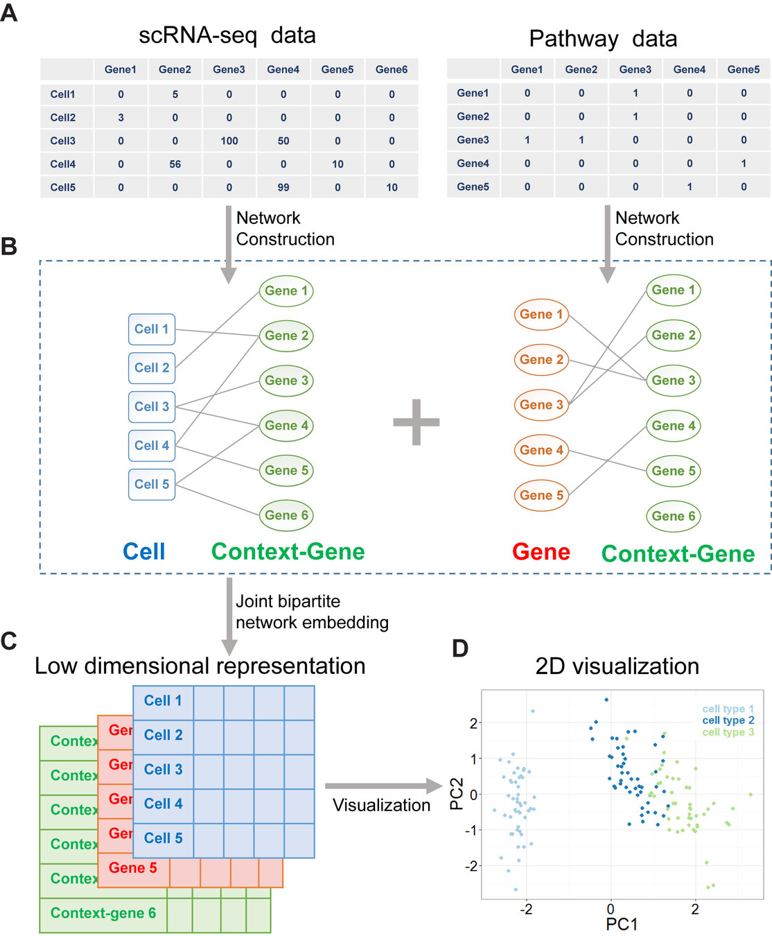 In the plot: Schematic of the GPLM model learning a mapping from a low-dimensional latent space to gene expression profiles per cell.