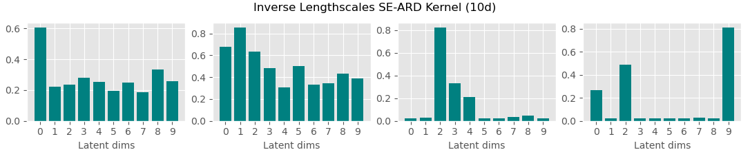 In the plot: Inverse lengthscales for each latent dimension. Both modes of inference switch off 7 out of 10 dimensions.