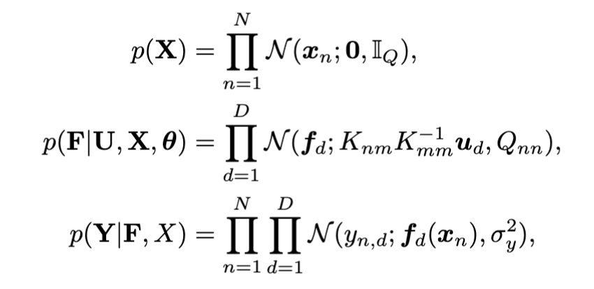 Stochastic variational inference for GP regression was introduced in Hensman et al (2013) (\( \mathcal{L}_{1}\) below). In this work we extend the SVI bound in two ways - we introduce the variational distribution over the unknown \(X\) and make \(Y\) multi-output.
