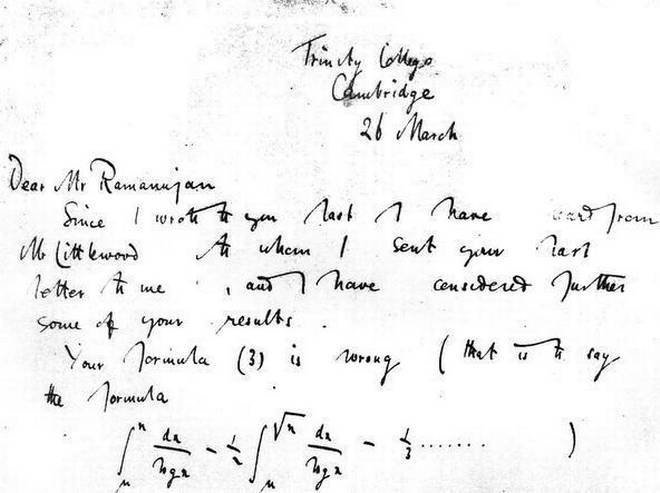 arrived at Trinity College, Cambridge addressed to mathematician G.H. Hardy.