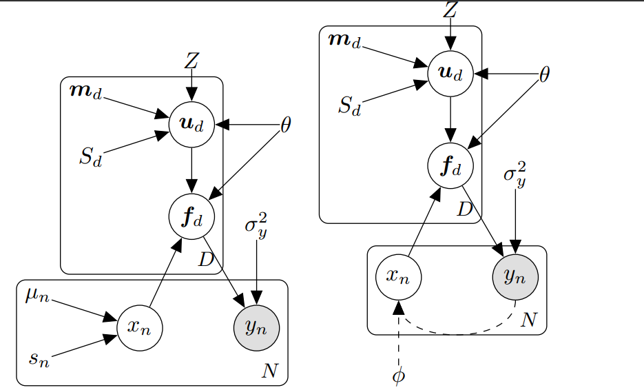 Mean-field Variational \(\longrightarrow\) \( q(\bm{x}_{n})\) is a factorised Gaussian (factorising across \(d\)).