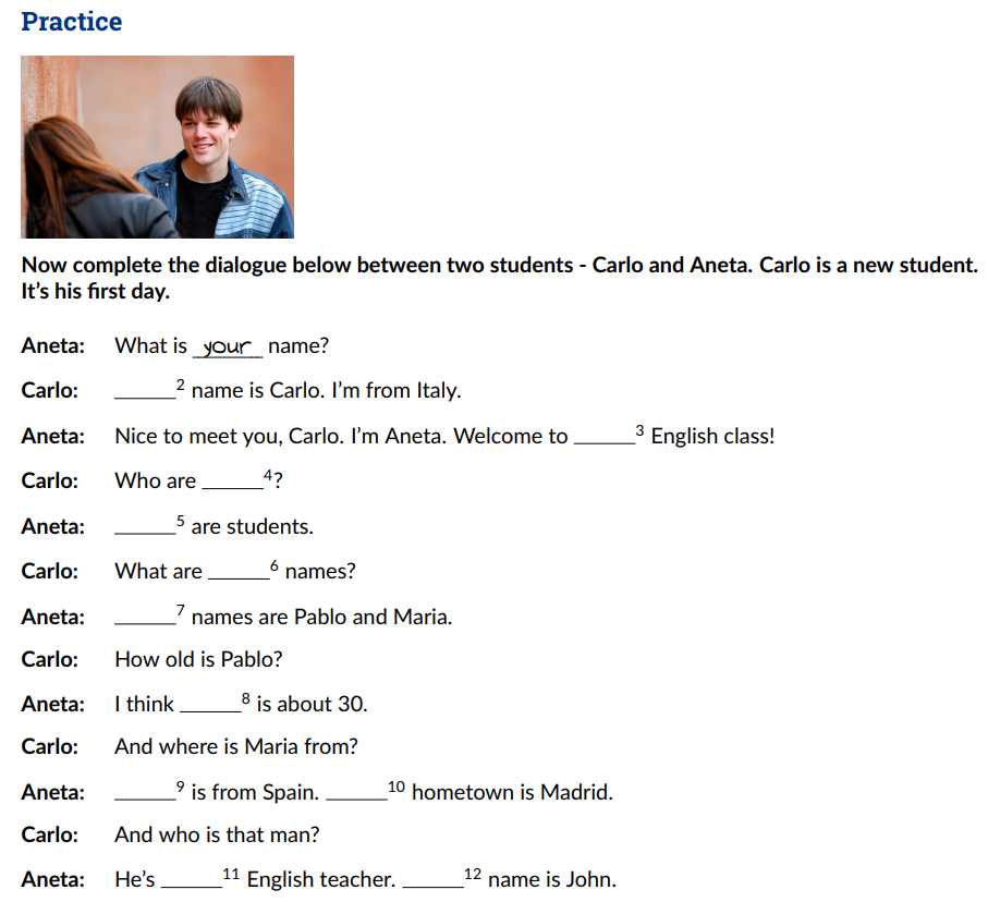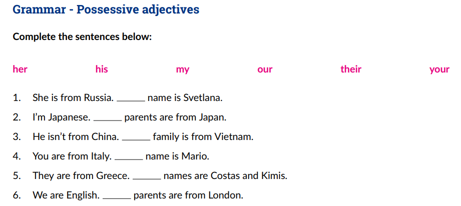 Writing Activity: Watch the next video-conversation and identify three sentences which use possesive adjectives.