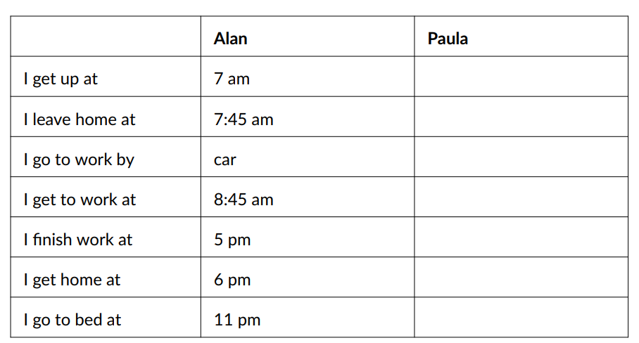 Listen to the conversation between Paula, an American woman who works in Tokio, and Alan. You will be asked to complete the table.