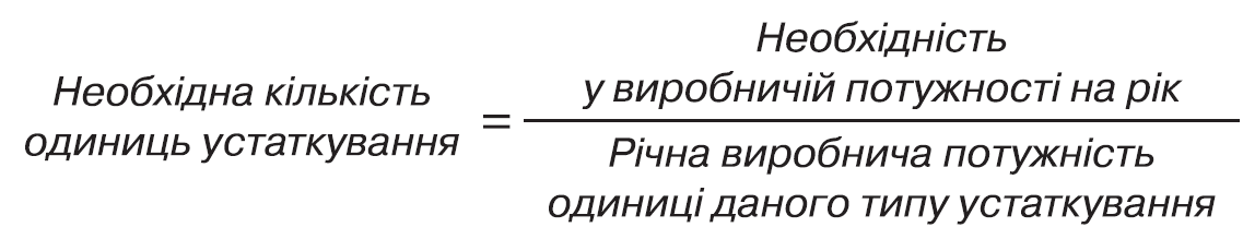 Дуже важливо розуміти, що у випадку реконструкції підприємства за наявності певного устаткування, необхідну кількість нового устаткування варто визначати співвідношенням з наявними виробничими потужностями, і тільки таким чином покривати дефіцит необхідних додаткових потужностей за рахунок нового обладнання.