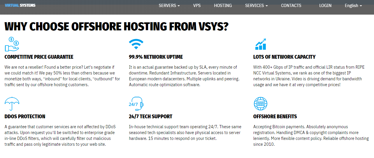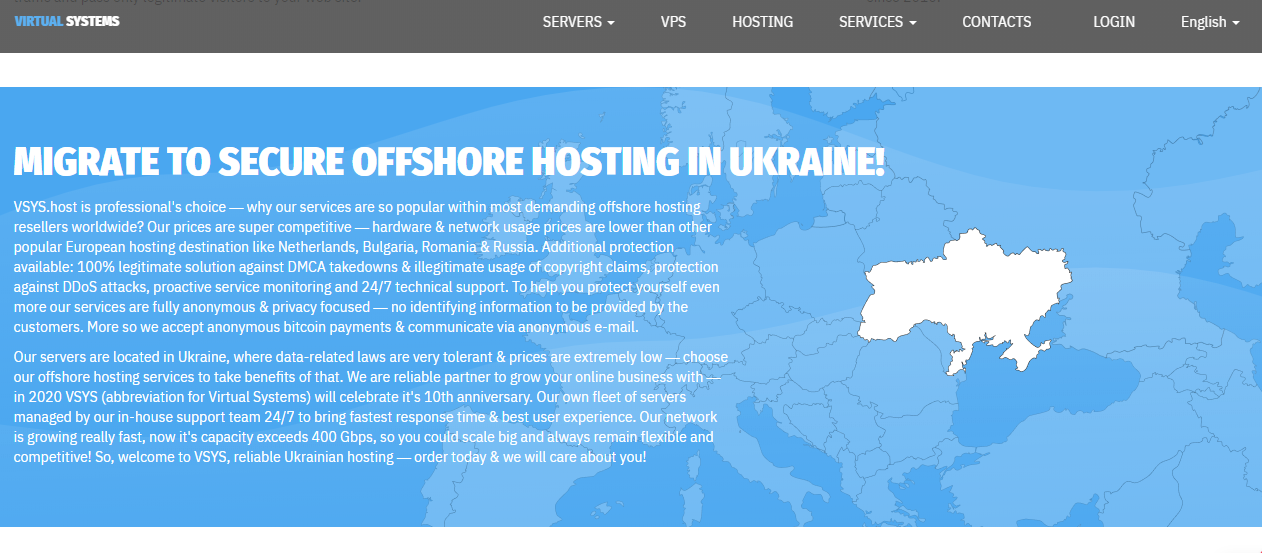 VSYS.host is offshore, no dmca web-hosting located in Ukraine, where data-related legislation are very tolerant & prices are very low - choose our offshore hosting services to take benefits of that. Visit our site https://vsys.host