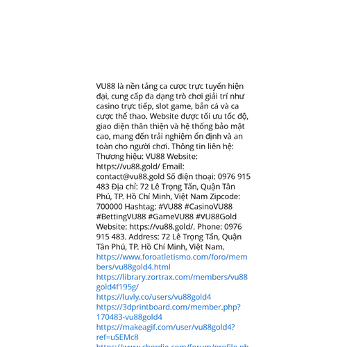 Website: https://vu88.gold/. VU88 là nền tảng ca cược trực tuyến hiện đại, cung cấp đa dạng trò chơi giải trí như casino trực tiếp, slot game, bắn cá và ca cược thể thao. Website được tối ưu tốc độ, giao diện thân thiện và hệ thống bảo mật cao, mang