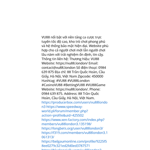 Website: https://vu88.london/. VU88 nổi bật với nền tảng ca cược trực tuyến tốc độ cao, kho trò chơi phong phú và hệ thống bảo mật hiện đại. Website phù hợp cho cả người chơi mới lẫn người chơi lâu năm với trải nghiệm ổn định, tin cậy. Thông tin liê