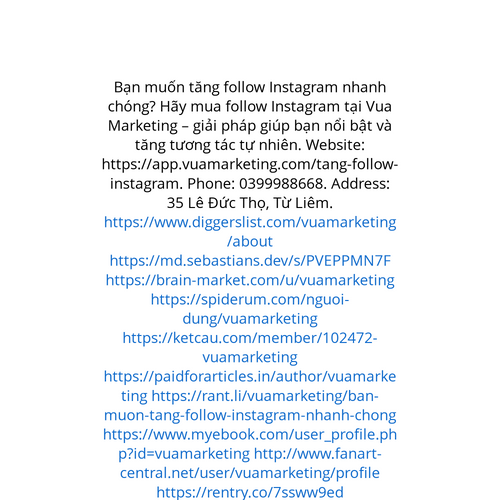 Website: https://app.vuamarketing.com/tang-follow-instagram. Bạn muốn tăng follow Instagram nhanh chóng? Hãy mua follow Instagram tại Vua Marketing – giải pháp giúp bạn nổi bật và tăng tương tác tự nhiên. Phone: 0399988668. Address: 35 Lê Đức Thọ,