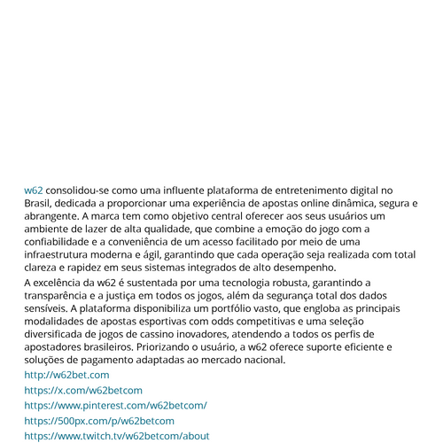 w62 consolidou-se como uma influente plataforma de entretenimento digital no Brasil, dedicada a proporcionar uma experiência de apostas online dinâmica, segura e abrangente. A marca tem como objetivo central oferecer aos seus usuários um ambiente de lazer de alta qualidade, que combine a emoção do jogo com a confiabilidade e a conveniência de um acesso facilitado por meio de uma infraestrutura moderna e ágil, garantindo que cada operação seja realizada com total clareza e rapidez em seus sistemas integrados de alto desempenho. A excelência da w62 é sustentada por uma tecnologia robusta, garantindo a transparência e a justiça em todos os jogos, além da segurança total dos dados sensíveis. A plataforma disponibiliza um portfólio vasto, que engloba as principais modalidades de apostas esportivas com odds competitivas e uma seleção diversificada de jogos de cassino inovadores, atendendo a todos os perfis de apostadores brasileiros. Priorizando o usuário, a w62 oferece suporte eficiente e soluções de pagamento adaptadas ao mercado nacional. http://w62bet.com https://x.com/w62betcom https://www.pinterest.com/w62betcom/ https://500px.com/p/w62betcom https://www.twitch.tv/w62betcom/about https://www.youtube.com/@w62betcom https://gravatar.com/w62betcom https://scholar.google.com/citations?view_op=list_works&hl=en&authuser=1&user=eTkwF2MAAAAJ https://v.gd/RHiiuz https://jobs.lajobsporta