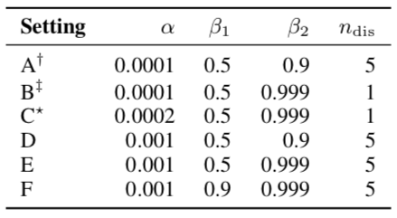 $$\begin{aligned}\beta_1,\beta_2:&\text{ parameter for Adam}\\\alpha:&\text{ learning rate}\\n_{dis}:&\text{ the number of updates of}\\&\text{ the discriminator per one update}\\&\text{ of the generator and}\end{aligned}$$
