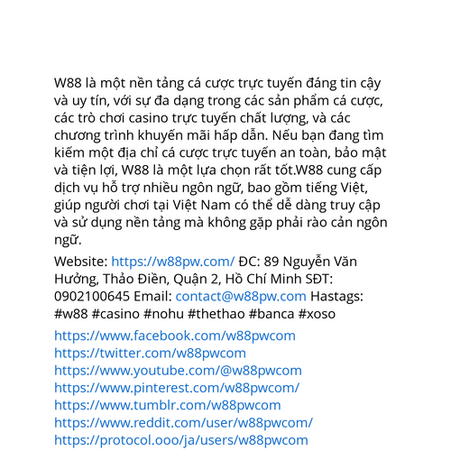 W88 là một nền tảng cá cược trực tuyến đáng tin cậy và uy tín, với sự đa dạng trong các sản phẩm cá cược, các trò chơi casino trực tuyến chất lượng, và các chương trình khuyến mãi hấp dẫn. Nếu bạn đang tìm kiếm một địa chỉ cá cược trực tuyến an toàn, bảo mật và tiện lợi, W88 là một lựa chọn rất tốt.W88 cung cấp dịch vụ hỗ trợ nhiều ngôn ngữ, bao gồm tiếng Việt, giúp người chơi tại Việt Nam có thể dễ dàng truy cập và sử dụng nền tảng mà không gặp phải rào cản ngôn ngữ. Website: https://w88pw.com/ ĐC: 89 Nguyễn Văn Hưởng, Thảo Điền, Quận 2, Hồ Chí Minh SĐT: 0902100645 Email: contact@w88pw.com Hastags: #w88 #casino #nohu #thethao #banca #xoso