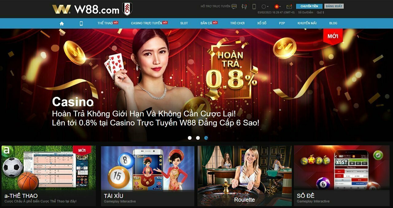 Casino Trực Tuyến: Nhà cái W88 cung cấp hàng loạt trò chơi Casino hấp dẫn đến người chơi với ứng dụng công nghệ Live trực tuyến đỉnh cao như Baccarat, Rồng/Hổ, Tài Xỉu, Blackjack, Roulette… Tham gia chơi Casino người chơi cũng sẽ có cơ hội nhận nhiều ưu đãi cực Hot như Hoàn trả ngay lập tức lên đến 0.8% khi chơi Casino trực tuyến.