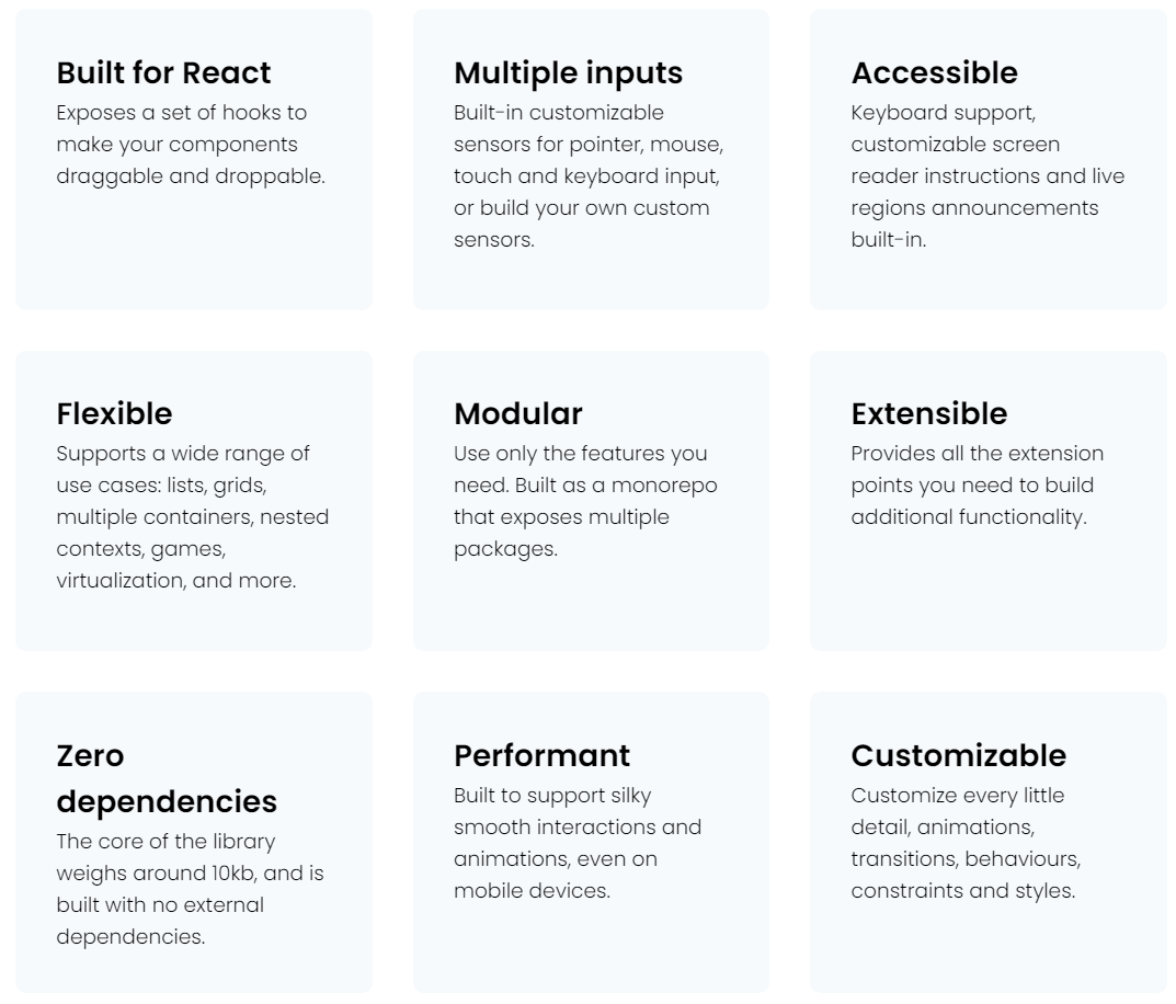 "A modular, lightweight, performant, accessible and extensible drag & drop toolkit for React."