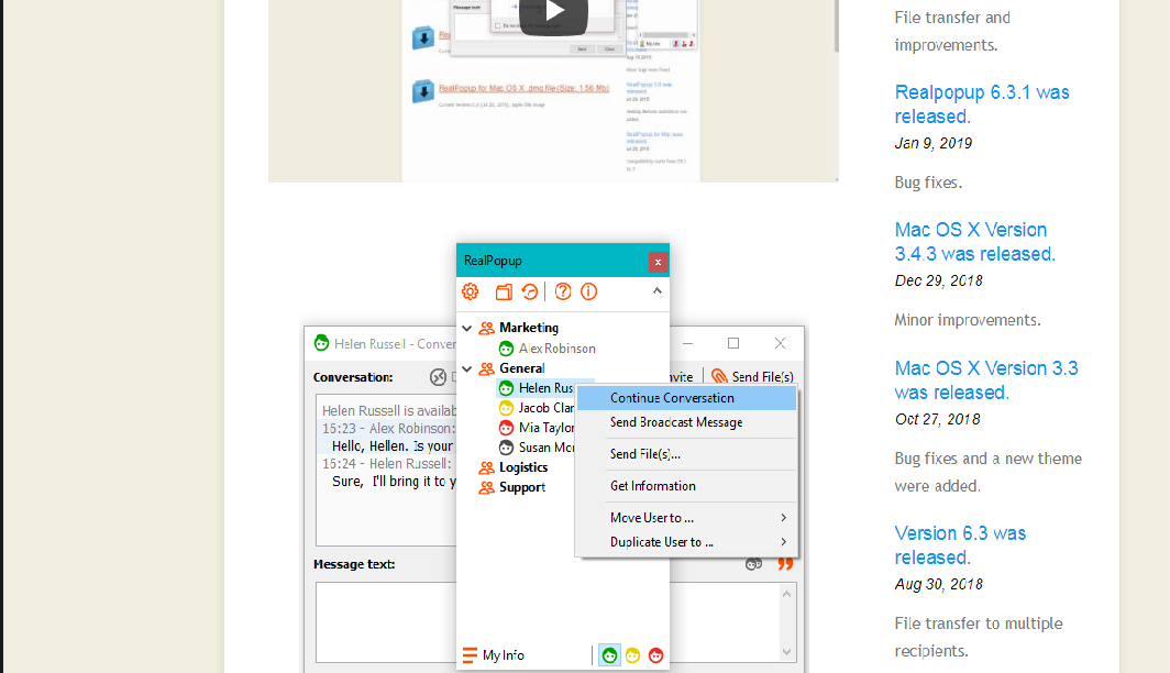 RealPopup LAN Chat, on the other hand, offers solid basics: person-to-person and group messaging, file transfers, voice/video calls, and mass broadcasting. It also uses AES encryption for data protection and logs message history. However, it lacks advanced admin controls, remote desktop, or offline messaging. File sharing is straightforward via drag-and-drop, and it's incredibly lightweight, focusing on simplicity without frills.