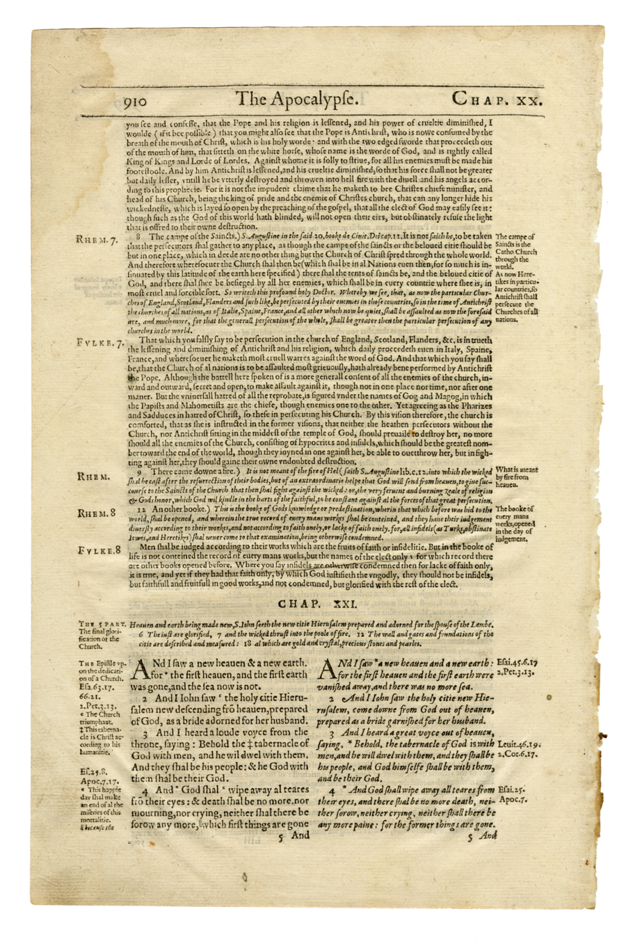 Rather than shocking imagery, the Book of Revelation in the Geneva Bible is known for its notes by Francis Junius. Later revisions of the Bible discontinued these notes, which were overtly anti-papal. On this leaf, the annotations to Revelation 17:4 compare the Roman clergy to the Whore of Babylon in describing the woman’s clothing: “A skarlet colour, that is, with a red and purple garment : and surely it was not without cause that the Romish clergy were so much delighted with this colour.”