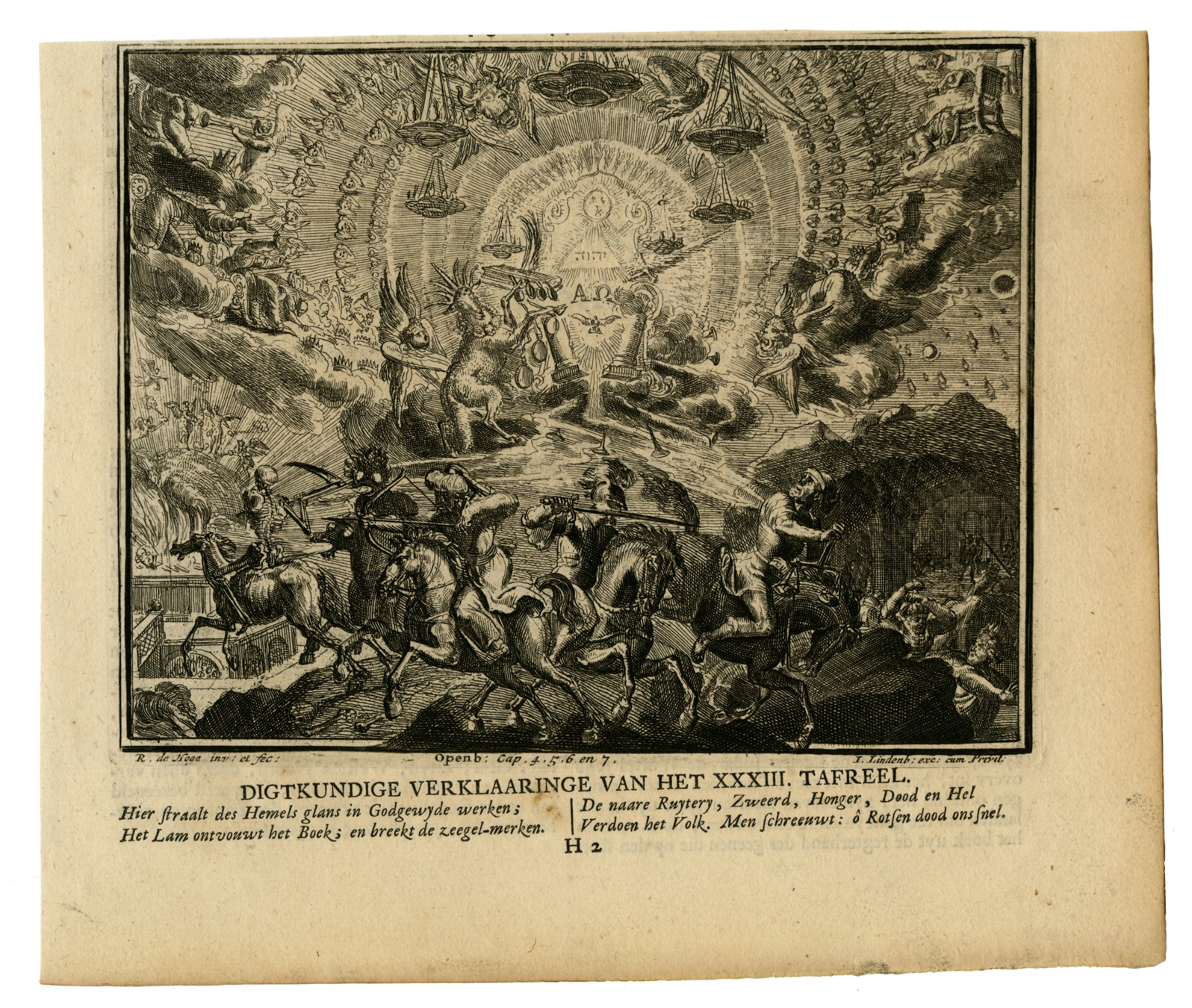 Romeyn de Hooghe, an artist of the late Dutch Golden Age, produced over 3,500 prints during his years of activity (1670-1715). De Hooghe’s art is characterized by his loose, sketch-like lines and heavy contrast in his shading. This style allows his images to contain striking amounts of detail, as seen in this engraving, which manages to capture Revelation chapters 4-7 in a single image.