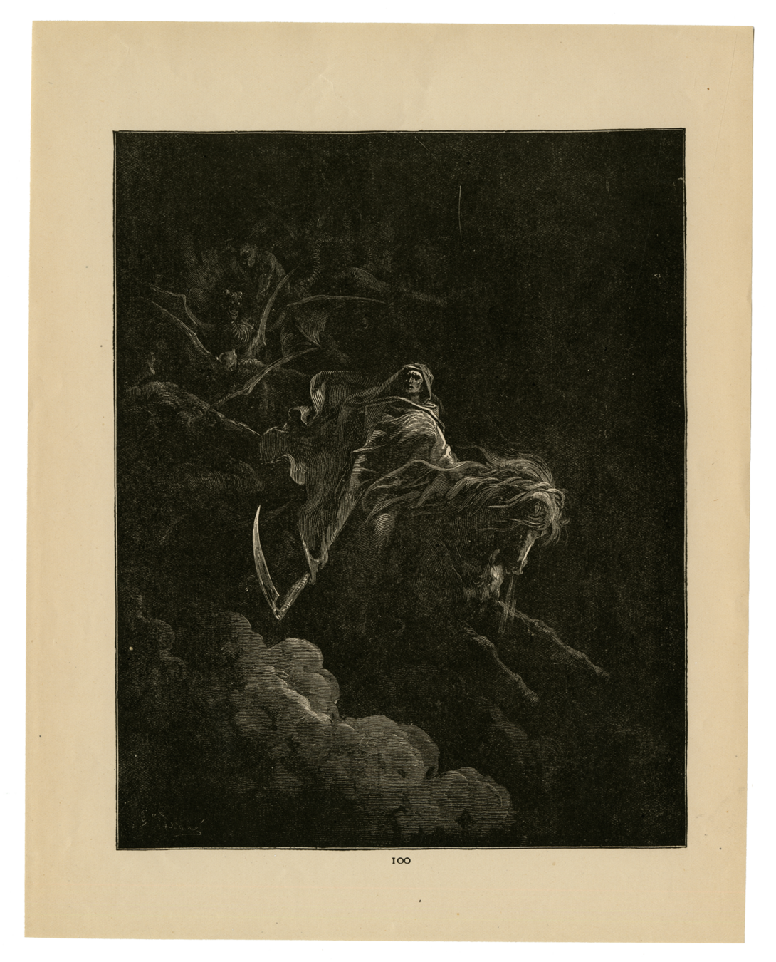 Gustave Doré, a French printmaker and illustrator, created 241 wood engravings for the 1866 Le Grand Bible de Tours , an edition of the 1843 French translation of the Vulgate. Two volumes were published simultaneously: one by Alfred Henry Armand Mame in France, the other by Cassell and Company in England. This engraving from Revelation 6:7-8 depicts the vision of Death upon a pale horse.