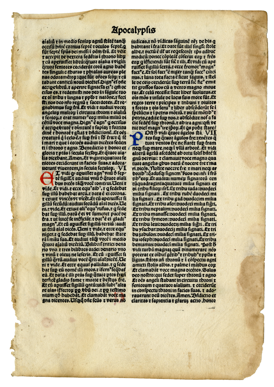 This leaf from Revelation 6:12-17, which shows the sky turning black and starless while kings and rich men hide themselves in the rocks, warns of the coming day of judgement, perhaps alluding to the medieval idea of memento mori which emphasized reflection on mortality and the imminent end of the world.