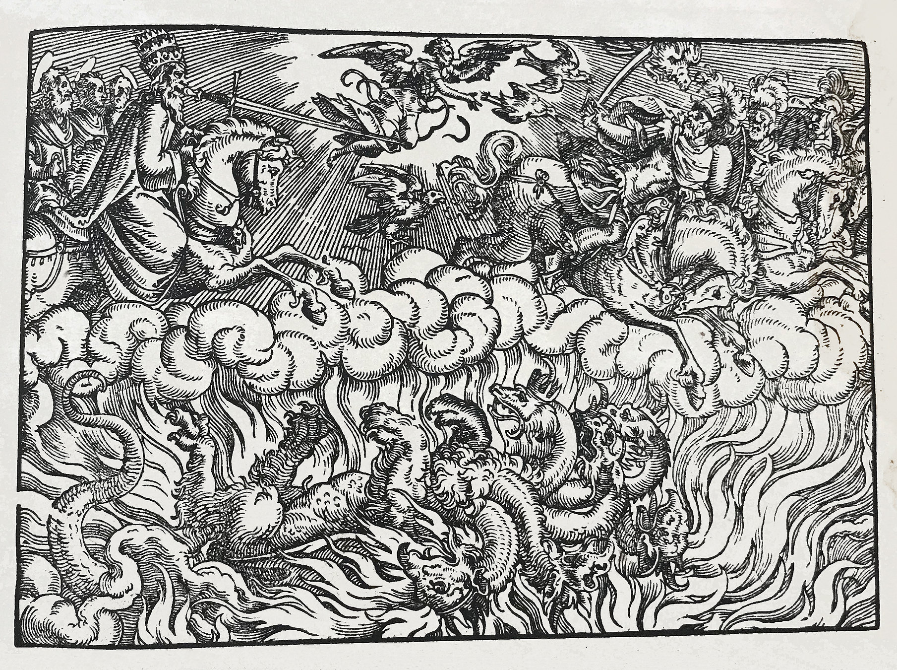 Sebastian Gryphius, also known as the "Prince of the Lyon book trade," ran a print-shop called Atelier du Griffon ("workshop of the griffin") for several decades after moving from Germany to France. His Apocalypse woodcuts were influenced by Albrecht Dürer’s grotesque and even affronting imagery.