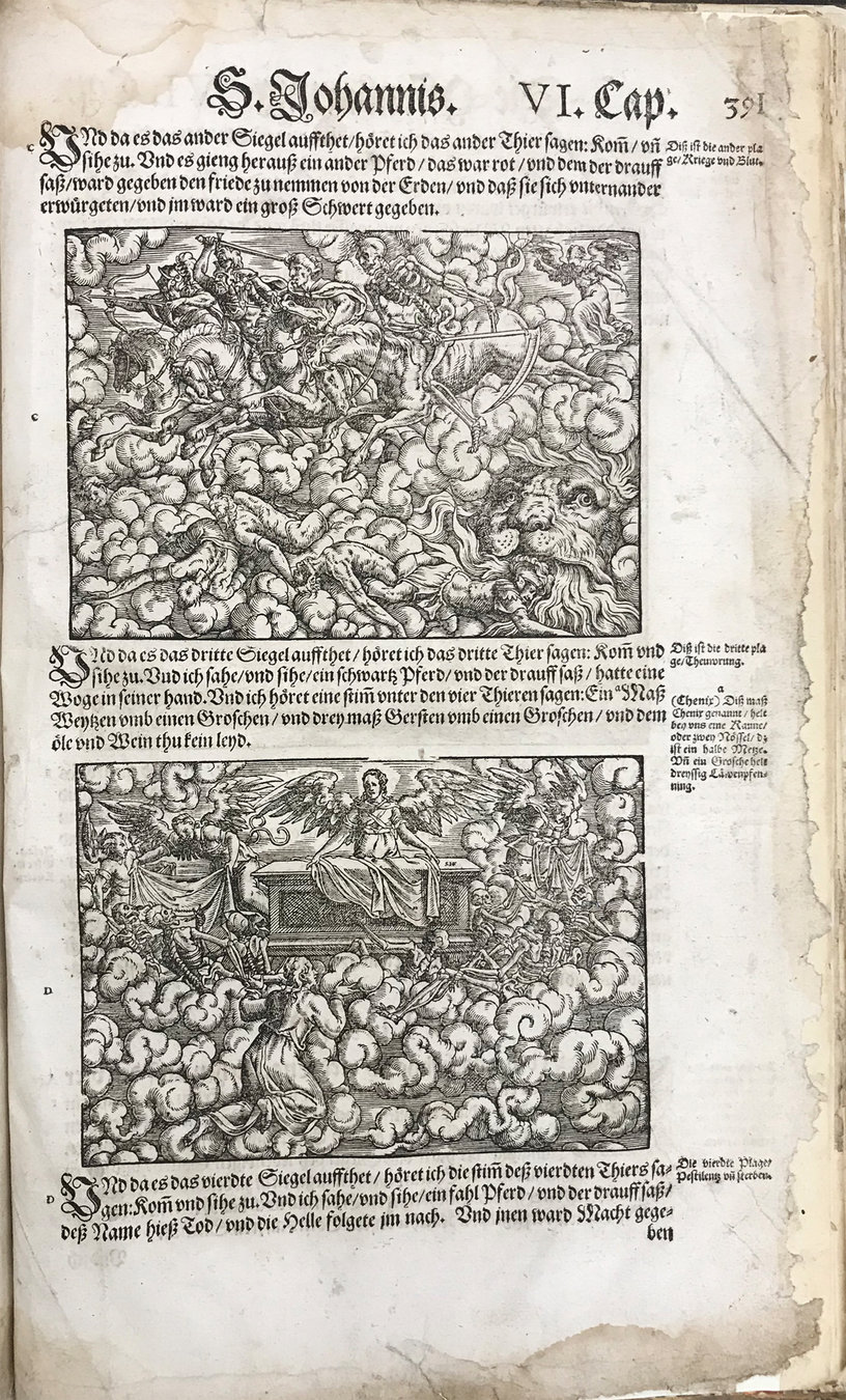 Many Apocalypse woodcuts are heavily influenced by the Danube School, particularly the work of Albrecht Dürer, whose emphasis on grotesque and impactful imagery is somewhat antithetical to Luther’s emphasis on an accessible and non-threatening approach to religious expression. The resulting tension between the image and the text illustrates the religious complexity and interdependency of the Reformation, and the often differing goals of the book printers and the text itself.