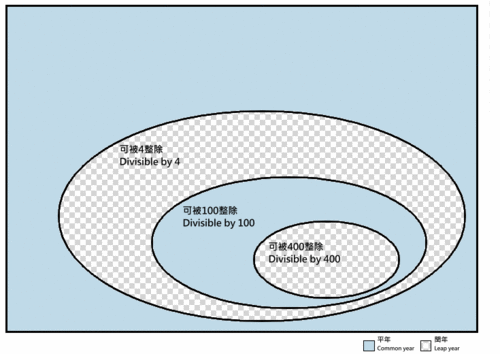 - 除以100可整除但除以400不可整除,為平年。