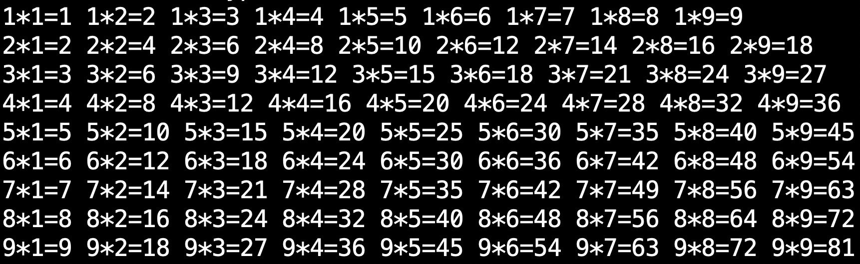 試著用迴圈輸出如下圖的99乘法表!