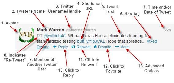 - 推文(tweet):即某條推特上更新的信息,長度是小於等於140個字符。你可以在裡面@某人、創建標籤、外鏈,或直接輸入普通文本都可以。