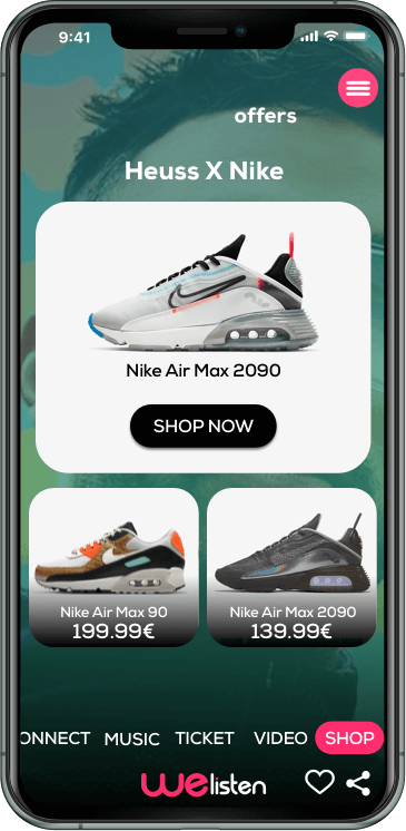 Mise en avant des produits phares du merchandising pour un envoi direct vers le site marchand de l'artiste