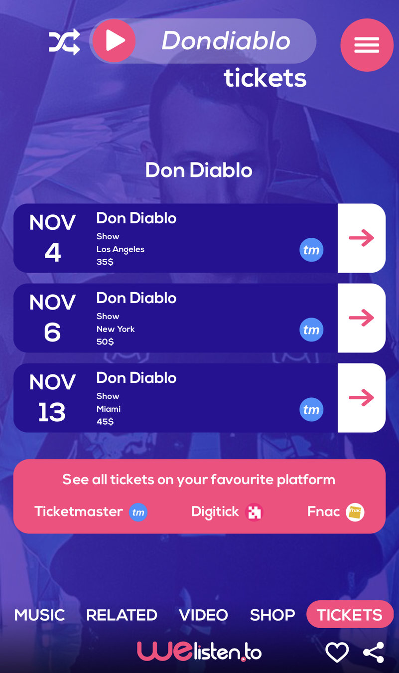 Ticket sales, redirecting to all the major purchasing platform (Digitick, Ticketmaster, ...)