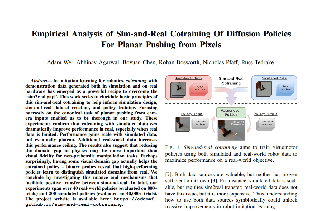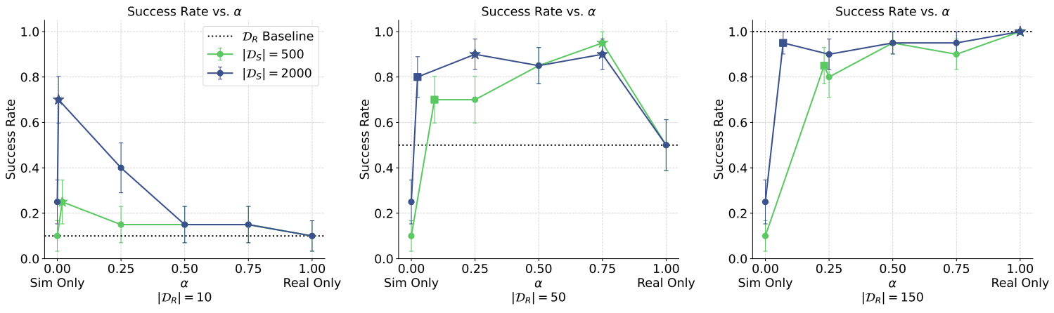 - Performance gains from scaling sim data plateau; additional real data raises the performance ceiling