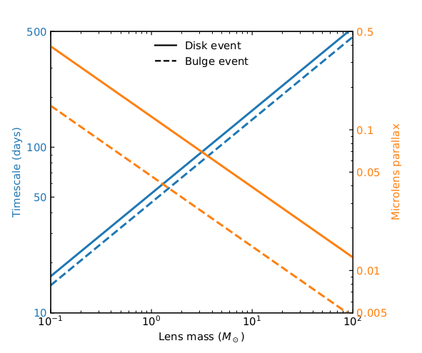 \( t_{\rm E} = \frac{\theta_{\rm E}}{\mu_{\rm rel}} \approx f(M_{\rm L}, D_{\rm L}, \mu_{\rm rel}) \)
