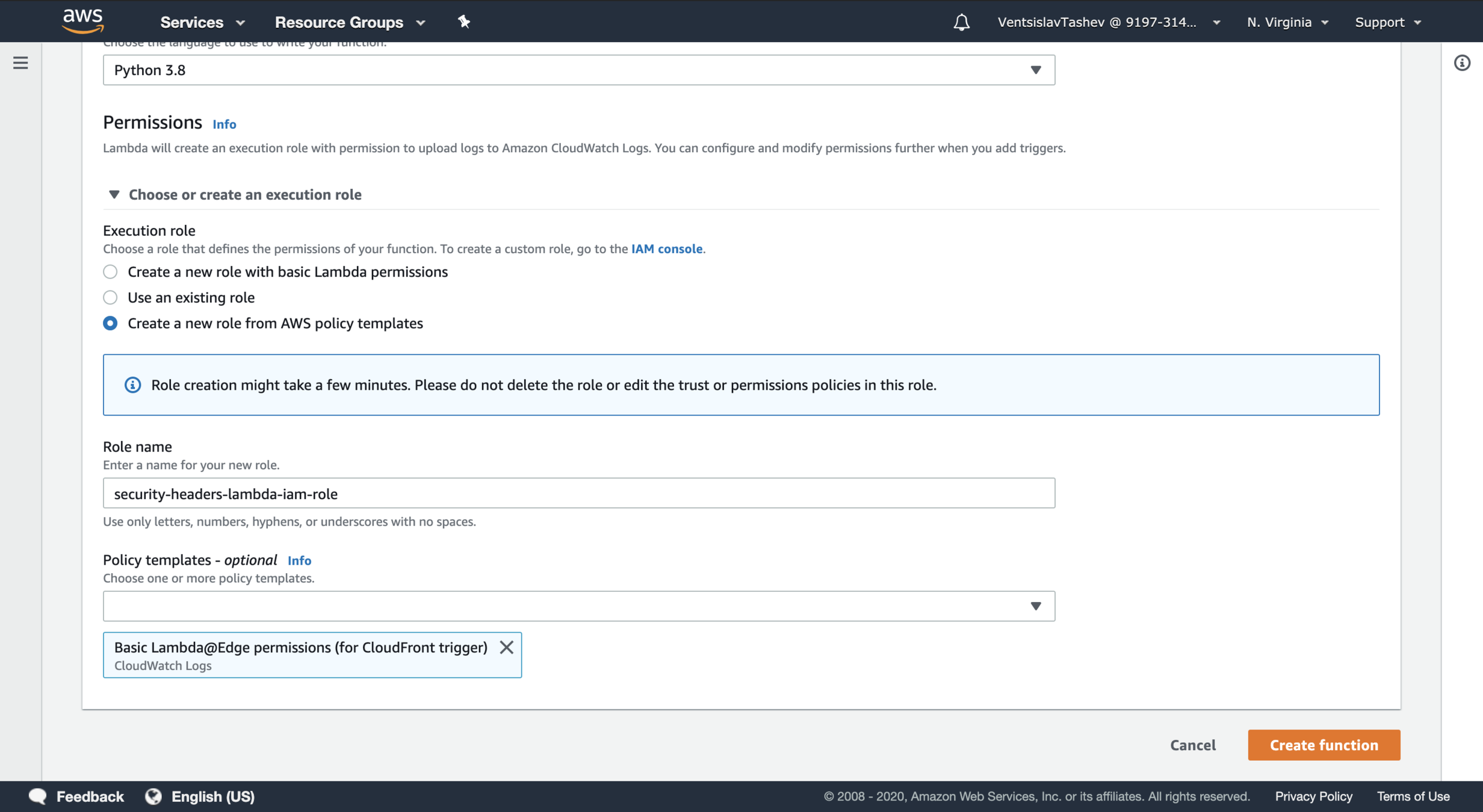 - Important: Lambda@Edge is currently supported in only one AWS region: us-east-1 (North Virginia)