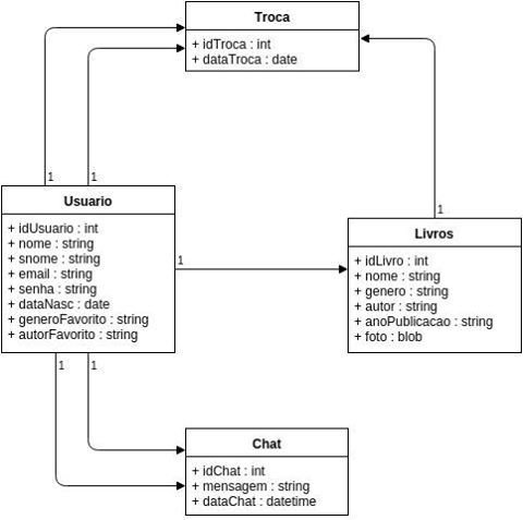 Esse projeto está sendo desenvolvido a partir de um projeto BIC-JR, cujas coordenadoras são as professoras Keilla Petrin e Joice Ribeiro com o fomento do CEFET-MG e da FAPEMIG. Estamos desenvolvendo um site e um aplicativo de trocas de livros, onde o usuário poderá entrar em contato com livros compatíveis com seu perfil literário. Para isso, serão cruzadas informações de perfis individuais, livros disponíveis e dados de geolocalização, tornando possível surgirem trocas entre perfis literários compatíveis entre usuários relativamente próximos.