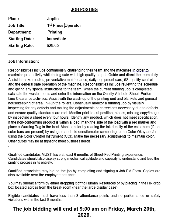 Plate Room 1st Shift