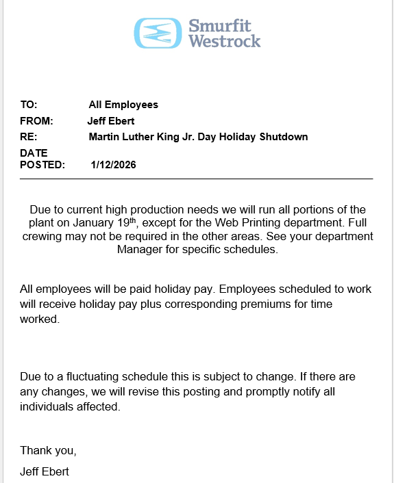If you are available on Thanksgiving morning and would like to support our fellow team members by handing out water, please contact James Henry at james.henry@westrock.com.