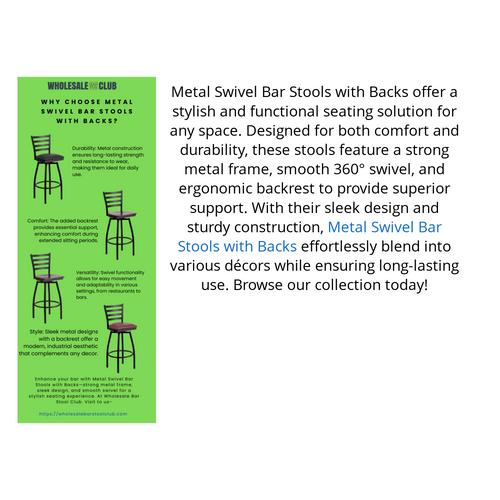 Metal Swivel Bar Stools with Backs offer a stylish and functional seating solution for any space. Designed for both comfort and durability, these stools feature a strong metal frame, smooth 360° swivel, and ergonomic backrest to provide superior support. With their sleek design and sturdy construction, Metal Swivel Bar Stools with Backs effortlessly blend into various décors while ensuring long-lasting use. Browse our collection today!