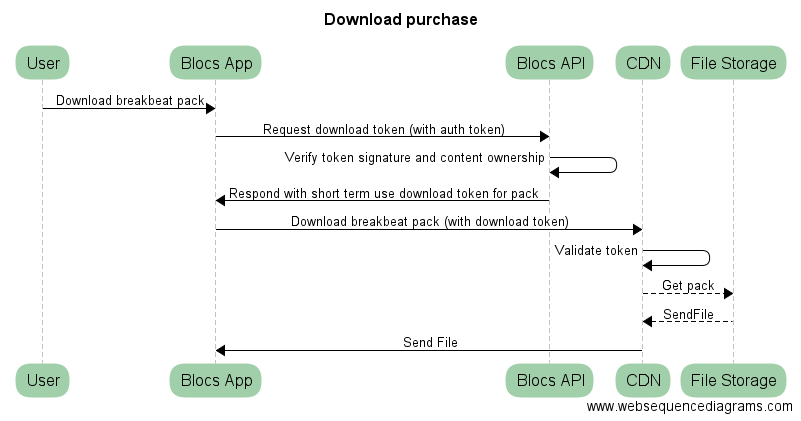 This endpoint checks whether the user has purchased the pack and returns a redirect to the download endpoint with a token containing the pack ID and an expiry time. This token is signed using a private key.