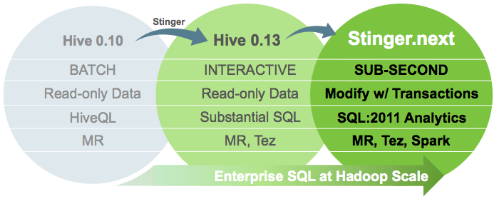 Hive es el estándar de facto para SQL en hadoop. Stinger.next es una iniciativa para evolucionar Hive y proveer SQL empresarial en escala hadoop.