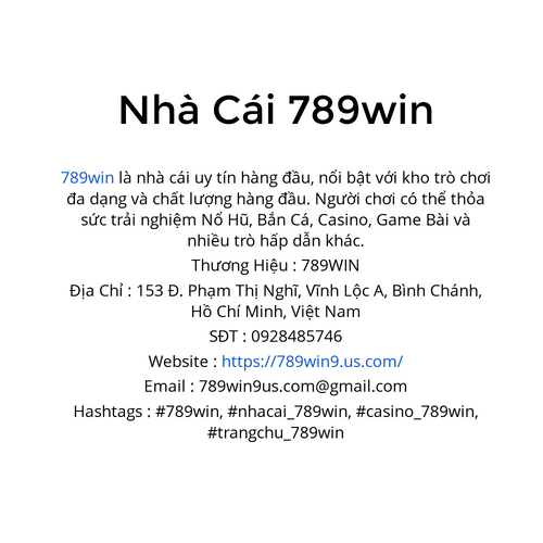 789win là nhà cái uy tín hàng đầu, nổi bật với kho trò chơi đa dạng và chất lượng hàng đầu. Người chơi có thể thỏa sức trải nghiệm Nổ Hũ, Bắn Cá, Casino, Game Bài Địa Chỉ : 153 Đ. Phạm Thị Nghĩ, Vĩnh Lộc A, Bình Chánh https://789win9.us.com/