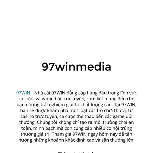 97WIN - Nhà cái 97WIN đẳng cấp hàng đầu trong lĩnh vực cá cược và game bài trực tuyến, cam kết mang đến cho bạn những trải nghiệm giải trí chất lượng cao. Tại 97WIN, bạn sẽ được khám phá một loạt các trò chơi thú vị, từ casino trực tuyến, cá cược thể thao đến các game đổi thưởng. Chúng tôi không chỉ tạo ra môi trường chơi an toàn, minh bạch mà còn cung cấp nhiều cơ hội trúng thưởng giá trị. Tham gia 97WIN ngay hôm nay để tận hưởng những khoảnh khắc đỉnh cao và săn thưởng lớn! Thông tin liên hệ: Website: https://97win.media/ Email: 97winmedia@gmail.com Địa chỉ: 25/1 Bà Lê Chân, Phường Tân Định, Quận 1, Hồ Chí Minh 700000, Việt Nam Phone: 0933562147 Hashtag: #97WIN #nhacai97win #97wincom #trangchu97win #linkvao97win #dangky97win #dangnhap97win #97winmedia
